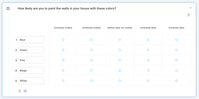 [matrix] <— question type aliasHow likely are you to paint the walls in your house with these colors? <— titleExtremely unlikely_Somewhat unlikely_Neither likely nor unlikely_Somewhat likely_Extremely likely <— column names separated by the underscore (_) characterBlue <— 1st rowGreen <— 2nd rowPink <— 3rd rowBeige <— ...White <— ...