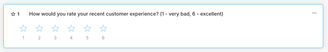 [rating] <— question type aliasHow would you rate your recent customer experience? (1 - very bad, 6 - excellent) <— title6 <— scale